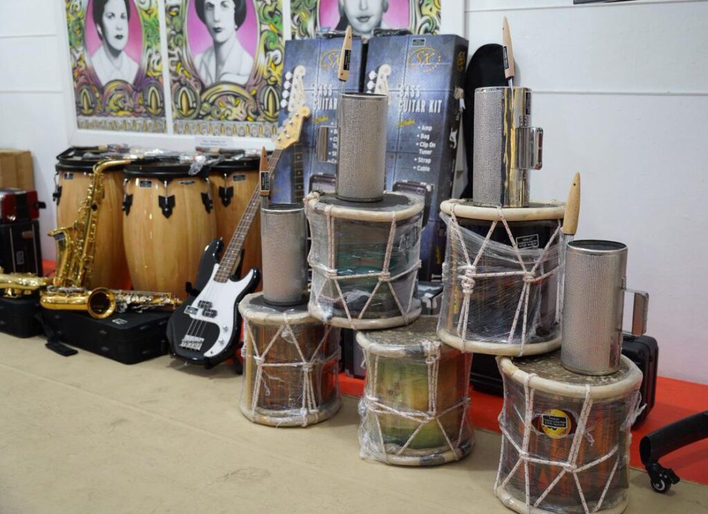 Posteriormente, fueron presentados los instrumentos y equipos recibidos, entre ellos cinco tamboras, dos congas, cinco güiras, cuatro acordeones, tres bajos eléctricos y dos saxofones alto destinados al apoyo pedagógico.