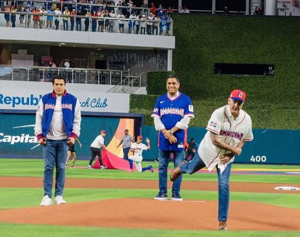El mandatario subió al montículo acompañado por el ministro de Deportes, Kelvin Cruz, y el ministro de Turismo, David Collado, como parte del respaldo del Gobierno dominicano al equipo nacional que compite en el principal torneo internacional de selecciones del béisbol.