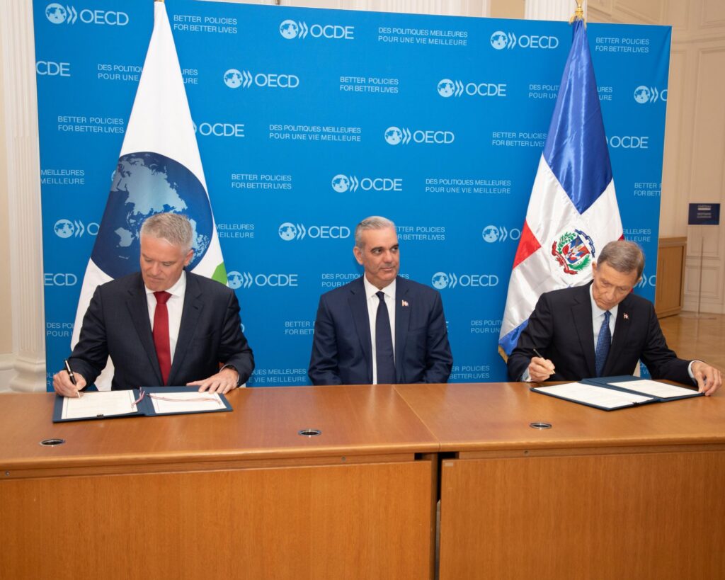 París, Francia. – En presencia del presidente Luis Abinader, el canciller Roberto Álvarez y el secretario general de la Organización para la Cooperación y el Desarrollo Económico (OCDE), Mathias Cormann, firmaron un Memorando de Entendimiento con el que las partes formalizan su acercamiento y buscan fomentar la cooperación, impulsar el intercambio de buenas prácticas, así como apoyar el fortalecimiento de políticas públicas conforme a estándares internacionales.