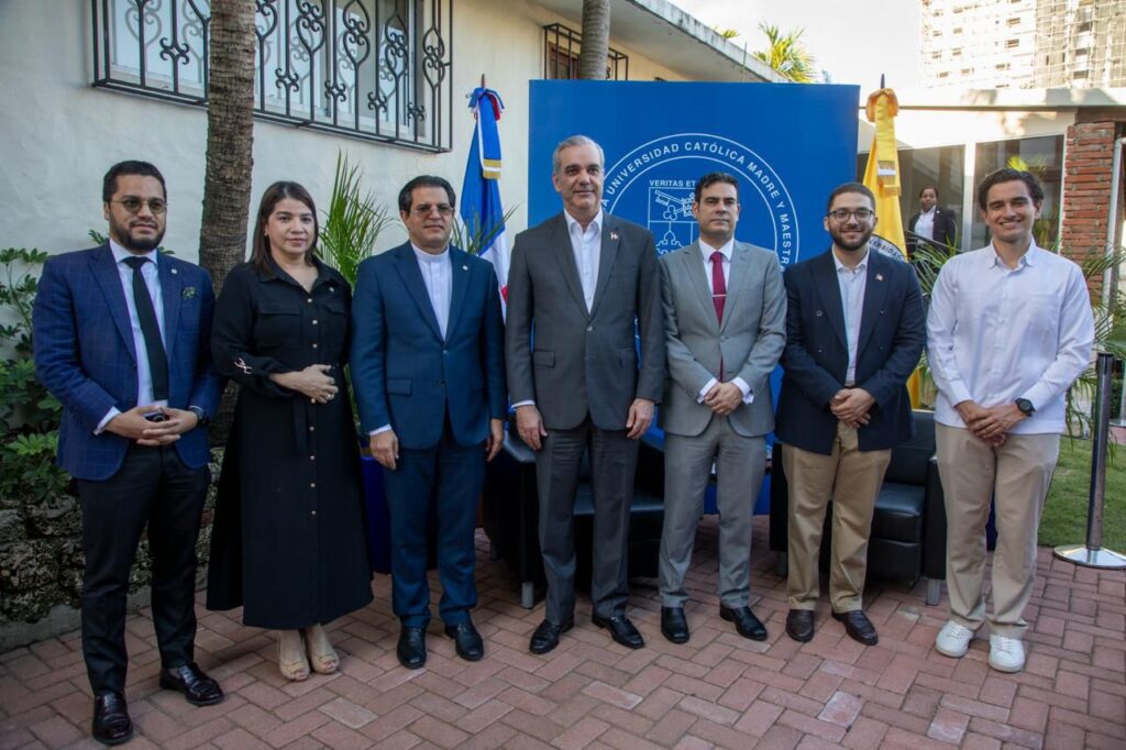 A su llegada, el jefe de Estado fue recibido por el rector de la PUCMM, reverendo padre doctor Secilio Espinal, junto al profesor y vicerrector académico Julio Ferreira, y la profesora Carolina Caba, decana de Estudiantes.