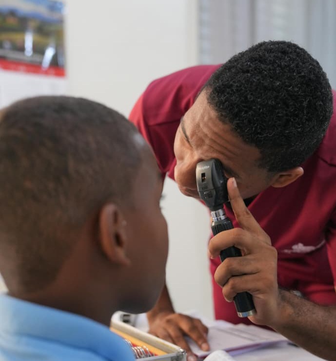 En salud visual, los estudiantes son evaluados mediante oftalmoscopia, autorefracción, pruebas de lentes y tonometría. Aquellos que requerían corrección visual recibieron la prescripción y, posteriormente, los lentes fabricados por la institución.